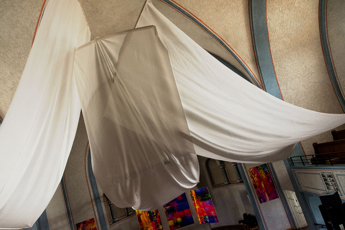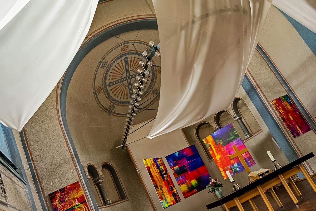 The recording of the video sound performance "Passion D'Image" gives an impression of the video installation. The video images were blasted into the dome of the Erlöserkirche in Langenfeld with three projectors on fabric panels and formed a three-dimensional color-sound-space.
